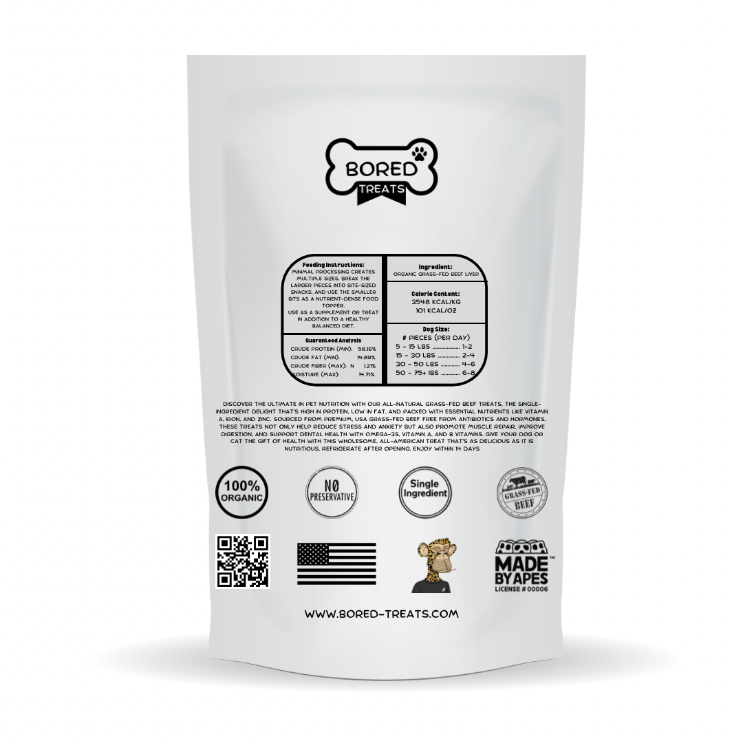 DISCOVER THE ULTIMATE IN PET NUTRITION WITH OUR ALL-NATURAL GRASS-FED BEEF TREATS, THE SINGLE-INGREDIENT DELIGHT THAT'S HIGH N PROTEN, LOW IN FAT. AND PACKED WITH ESSENTIAL NUTRIENTS LIKE VITAMIN A, IRON, AND ZINC. SOURCED FROM PREMIUM, USA GRASS-FED BEEF FREE FROM ANTIBIOTICS AND HORMONES, THESE TREATS NOT ONLY HELP REDUCE STRESS AND ANXIETY BUT ALSO PROMOTE MUSCLE REPAIR, IMPROVE DIGESTION, AND SUPPORT DENTAL HEALTH WITH OMEGA-3S, VITAMIN A, AND B VITAMINS. GIVE YOUR DOG OR CAT THE GIFT OF HEALTH WITH THIS WHOLESOME, ALL-AMERICAN TREAT THAT'S AS DELICIOUS AS IT IS NUTRITIOUS. REFRIGERATE AFTER OPENING. ENJOY WITHIN 14 DAYS